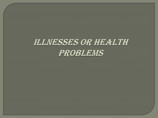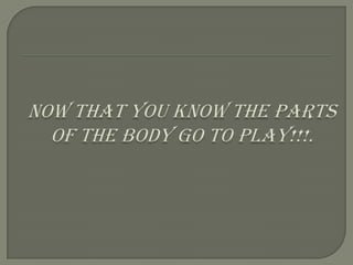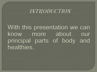 This document provides vocabulary and information about parts of the body in both English and Spanish. It begins with introductory sentences welcoming the reader to learn English and providing free exercises. It then lists body parts categorized by head/face, arms/legs, and other areas of the body. Additional vocabulary includes related verbs, adjectives, and questions. Illustrations show examples of common illnesses and injuries. Links to other resources on this topic are also included.