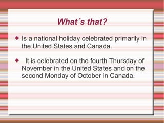 Thanksgiving is celebrated in the United States and Canada to give thanks for the harvest. In the US it occurs on the fourth Thursday of November, in Canada on the second Monday of October. The tradition has roots in religious celebrations in 16th century England to commemorate successful harvests. In the US, the modern Thanksgiving is traced to a 1621 harvest celebration held by the Pilgrims in Plymouth, Massachusetts, which has become a national holiday.