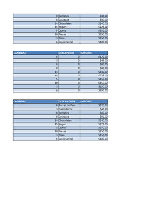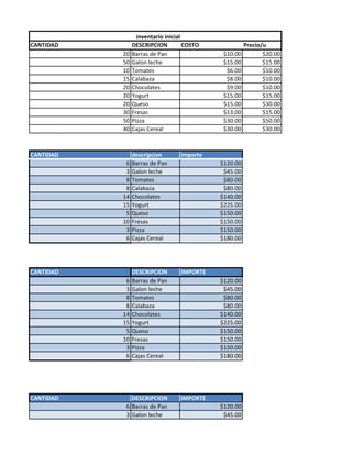 The document contains an initial inventory listing various food items with quantities, descriptions, costs and prices. It then shows the amounts sold of each item and the total import. Finally, it lists discounts, profits and the remaining final inventory quantities. It tracks the inventory of various food items from the initial amounts, amounts sold and remaining final inventory after accounting for sales and profits/discounts.