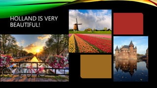 Holland is summarized as a beautiful country with Amsterdam as its capital city. The flag is described as red, blue and white. Traditional dance is the Dutch folk dance and some typical foods mentioned include rain cake, mini pancakes, doughnuts and stamppot. The document appears to be school work from Portuguese students in 5th grade during November 2017.