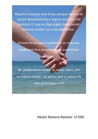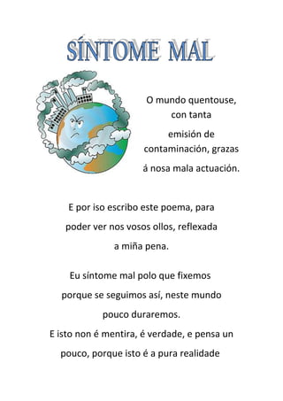 -200660901700 <br />Omundo quentouse, con tanta<br />emisión de contaminación, grazas<br />á nosa mala actuación.<br />E por iso escribo este poema, para<br />poder ver nos vosos ollos, reflexada<br />a miña pena.Eu síntome mal polo que fixemos,<br />porque se seguimos así, neste mundo<br />pouco duraremos.<br />E isto non é mentira, é verdade, e pensa un<br />pouco, porque isto é a pura realidade.<br />-146685-499745Respira tranquilo esta brisa, porque dentro de pouco desaparecerá, e seguro que non che gustará. O que eu digo é que deberíamos intentar acabar con este problema…<br />Simplemente que o problema se reducise,<br /> aínda que fora necesario que aumentase<br />a crise.<br />Se puideramos xuntar as nosas mans, por<br />un futuro mellor, eu penso que a catástrofe<br />non sería maior !!!!!<br /> <br /> Héctor Romero Romero 1º ESO <br />