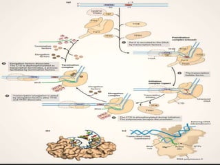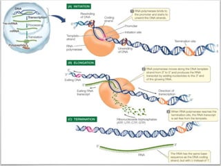 Transcription is the process by which DNA directs the synthesis of RNA, involving three main steps: initiation, elongation, and termination. In prokaryotes, RNA polymerase binds to specific DNA sequences called promoters, while eukaryotes utilize multiple RNA polymerases and transcription factors for this process. Post-transcriptional modifications in eukaryotes include 5' capping and the addition of a poly A tail, which stabilize mRNA and facilitate translation.