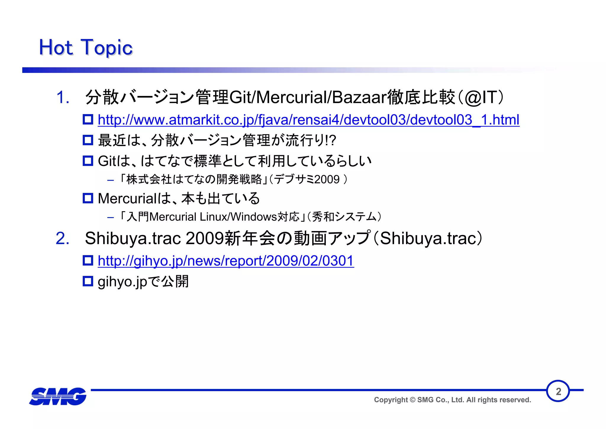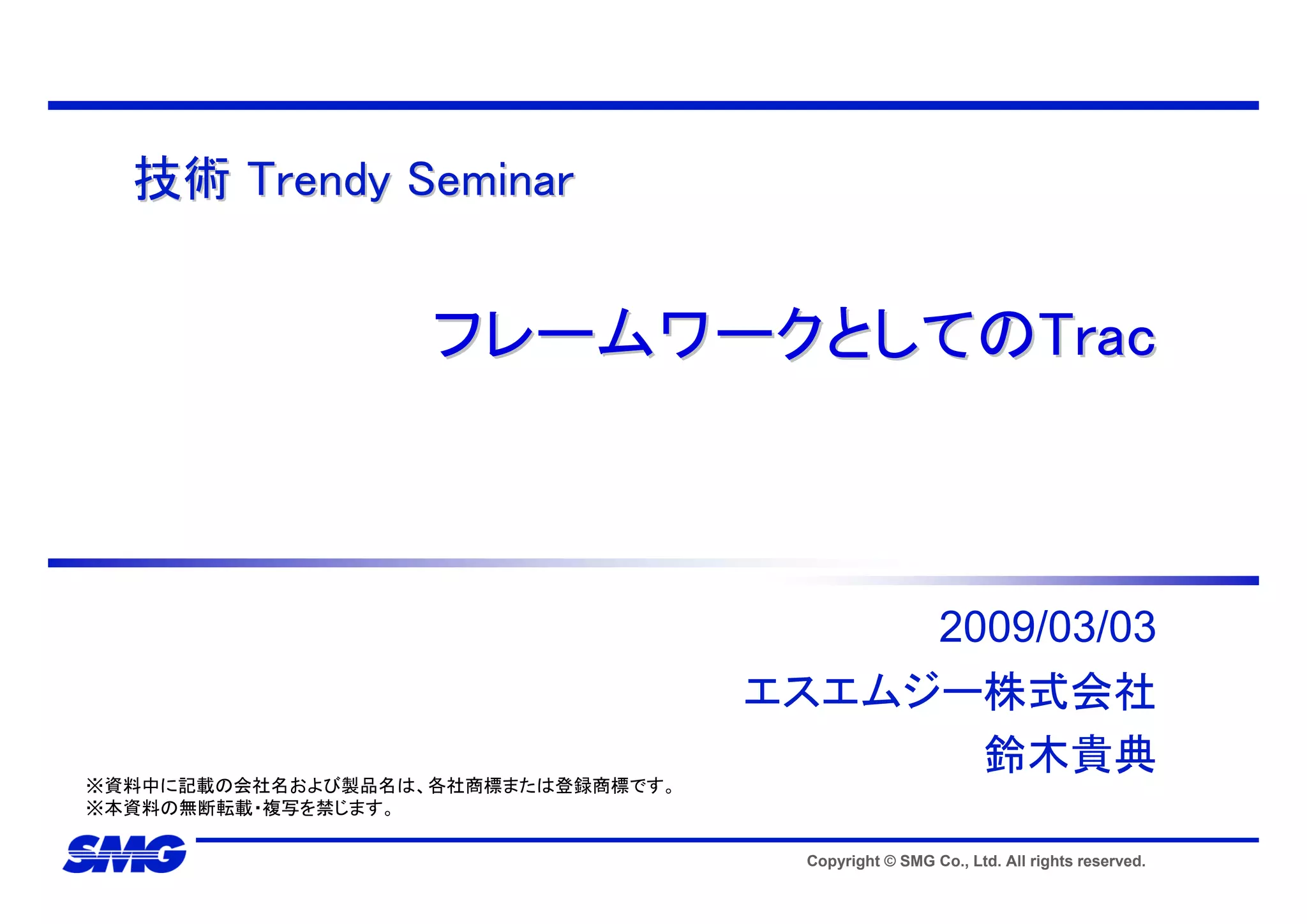 Trac is an open source project management and issue tracking tool. It integrates tightly with Subversion for version control and has a rich set of plugins. Trac uses a component architecture and plugins can be developed independently and added to Trac freely. The core components include an HTML interface using Genshi templating, configuration via trac.ini files, and APIs for tickets, databases, and permissions. This allows for a modular design and extensible functionality.