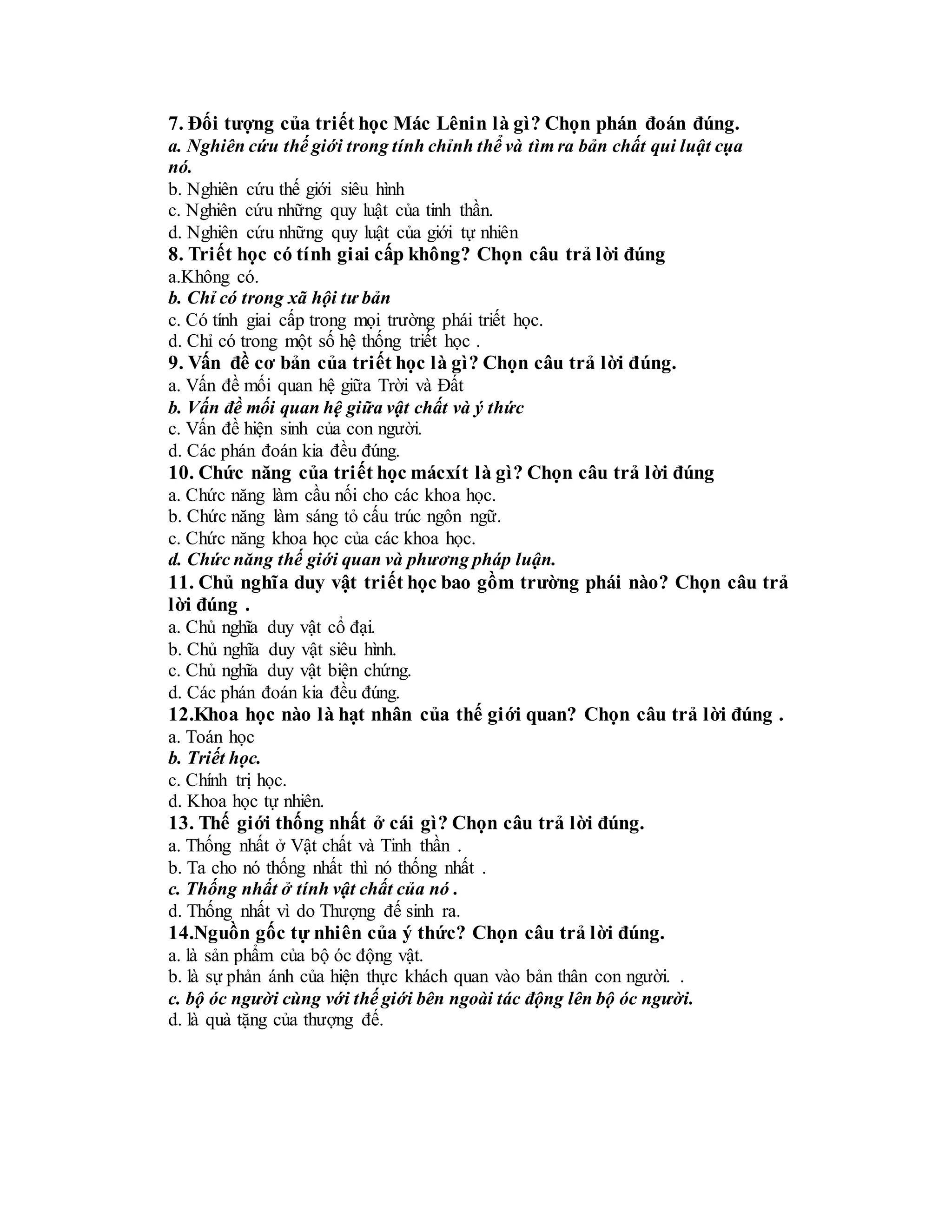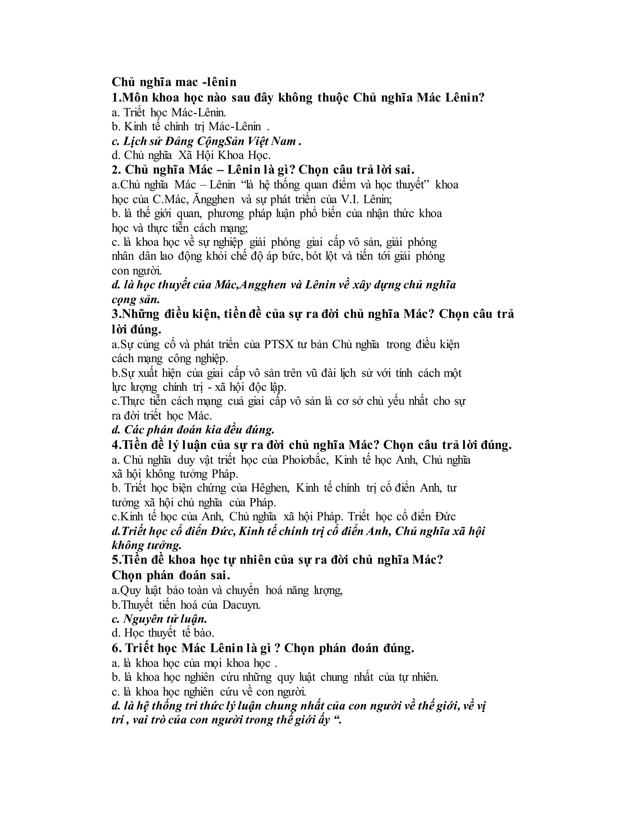 Tài liệu đưa ra nhiều câu hỏi và lựa chọn liên quan đến chủ nghĩa Mác - Lênin, bao gồm khái niệm, tiền đề ra đời, triết học Mác - Lênin, và sự phân tích các phạm trù chất, lượng, cách mạng, và các quy luật biện chứng. Nó cũng thảo luận về chức năng của triết học và mối quan hệ giữa chất và lượng trong sự phát triển. Bên cạnh đó, có các câu hỏi chính trị và lịch sử liên quan đến Cách mạng tháng 8/1945 ở Việt Nam.