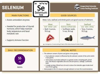 This document discusses trace elements and microminerals that are essential for human nutrition. It defines trace elements as minerals needed in small amounts like iron, iodine, fluorine, zinc and copper. It outlines the functions, dietary requirements and sources of these key microminerals. It further describes deficiencies that can arise from inadequate intake of minerals like iron-deficiency anemia and iodine deficiency disorders. The document concludes with highlighting national programs in place for prevention and control of micromineral deficiencies in populations.