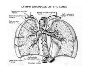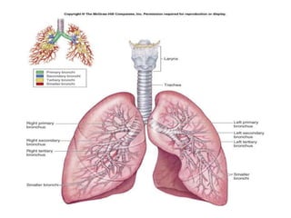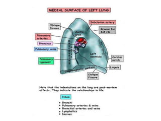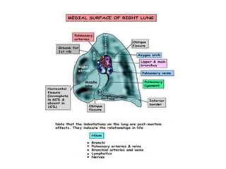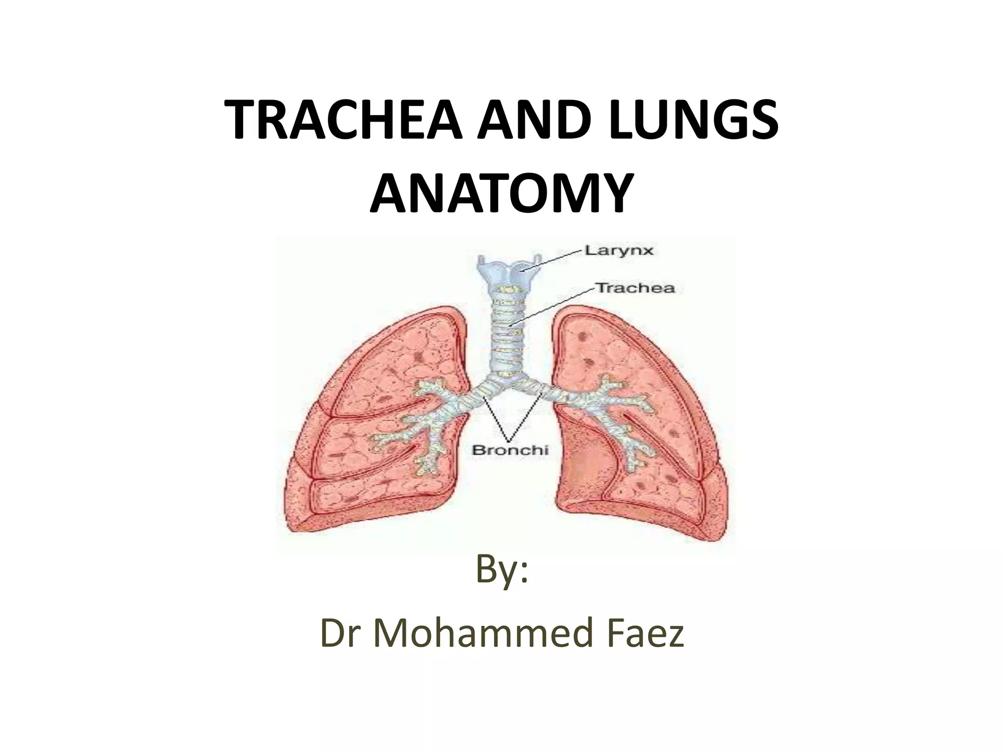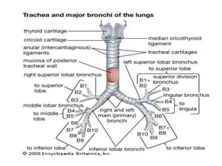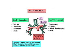 The trachea is a cartilaginous tube that extends from the larynx to the lungs. It divides at the carina into the right and left main bronchi. The right bronchus is wider, shorter and more vertical, while the left is smaller but longer. The bronchi continue dividing within the lungs to form the bronchial tree which supplies the lungs. Each lung has a root, hilum, lobes, borders and surfaces. The lungs are supplied by the pulmonary arteries and veins and are innervated by the pulmonary plexus.