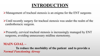 This case series analyzes 25 patients with tracheal stenosis treated between 2011-2021. Most patients were younger than 25 years old and the stenosis was caused by intubation in 23 cases. Surgical techniques included tracheal resection and anastomosis. Outcomes were successful in 23 cases, with only 2 cases experiencing restenosis. The conclusion emphasizes that tracheal resection and reconstruction can successfully treat stenosis when performed by experienced surgeons, with careful attention to anatomy and tension-relieving sutures for wound healing.