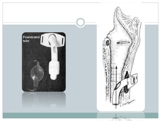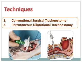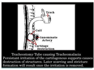 The document provides a comprehensive overview of tracheostomy, including its history, indications, contraindications, surgical techniques, and postoperative care. It discusses the anatomy involved, types of tracheostomy, and complications associated with the procedure. Additionally, guidelines for tracheostomy care and management, especially in pediatric patients, are highlighted, focusing on proper techniques and potential complications.