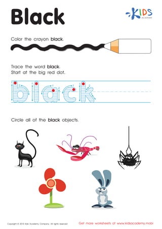 The document contains a variety of educational activities for children focused on coloring and tracing words related to different colors. It instructs children to color crayons in specified colors, trace corresponding color words, and identify objects of those colors. This material is intended for use in an educational setting and is copyrighted by Kids Academy Company.