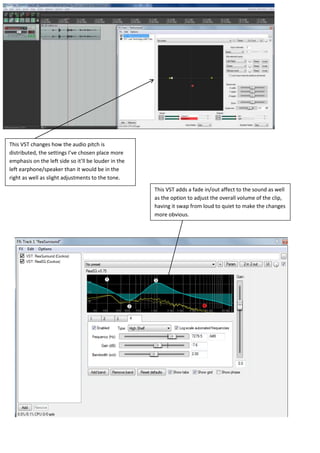 This VST plugin alters the audio pitch distribution to emphasize the left side more so it is louder in the left earphone than the right with slight tone adjustments. It also adds a fade in and out effect to the sound and allows adjusting the overall volume of a clip to make loud to quiet changes more obvious.