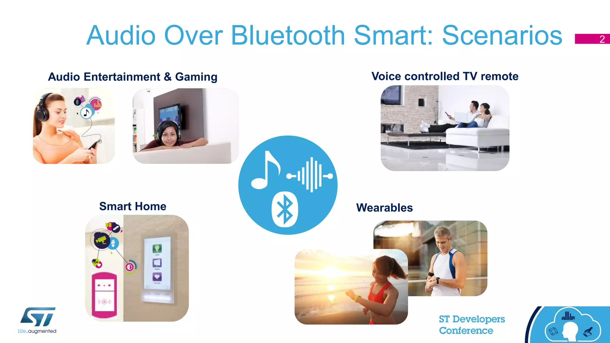 This document provides an overview of Roberto Sannino's presentation on BlueVoice, STMicroelectronics' solution for playing high-quality audio over Bluetooth Low Energy. BlueVoice uses advanced audio processing and compression techniques like ADPCM to stream compressed audio data over BLE at rates up to 64 kbps, enabling applications like voice-controlled devices, wireless audio, and the internet of audio things. The document describes BlueVoice's architecture, software libraries, development kits, and example applications to demonstrate voice streaming to mobile and cloud services using STM32 and BlueNRG hardware.
