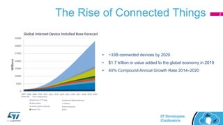 - The document discusses the need for security in IoT devices as the number of connected devices grows exponentially to over 30 billion by 2020.