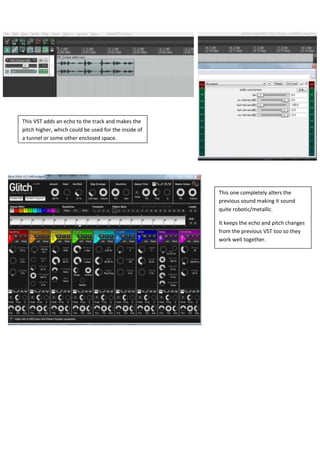 This VST plugin adds echo and raises the pitch of an audio track to make it sound like it is inside an enclosed space such as a tunnel. Another VST completely transforms the original sound into a robotic or metallic tone while retaining the echo and pitch alterations of the first VST, allowing the two to work well in combination.