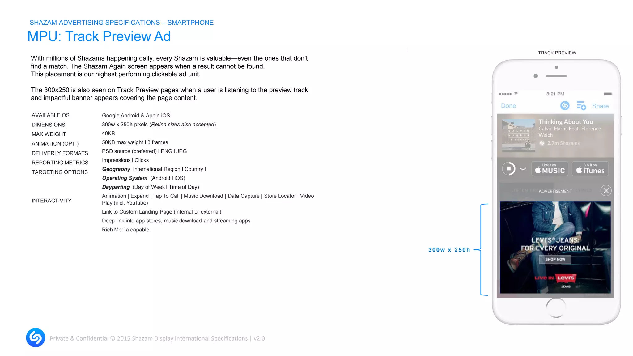 This document provides specifications for mobile advertising on the Shazam app, including dimensions of 300x250 pixels, a maximum file size of 50KB, and the ability to include up to 3 animation frames. It lists available interactivity options like tapping to call or linking to external pages. The summary describes the placement as Shazam's highest performing clickable ad unit, appearing when a song cannot be identified or on track preview pages.