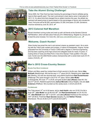 The summary provides an overview of the document which discusses the recent cross-country and track seasons for William and Mary. It highlights some of the team's accomplishments and top performances. It also provides information on upcoming events and encourages donations to support the teams.