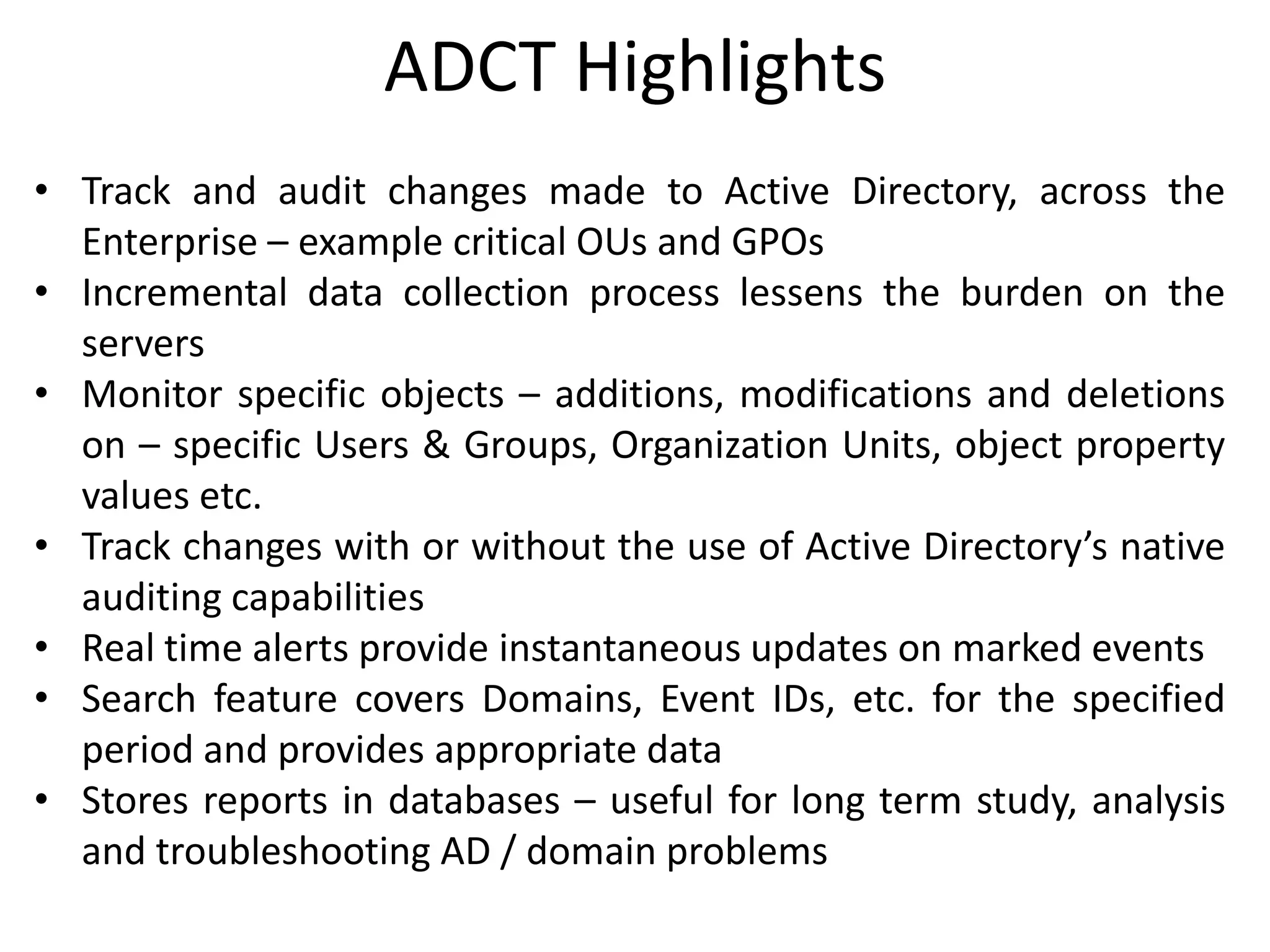 The Active Directory Change Tracker (ADCT) is a solution from Vyapin Software that tracks and audits changes in Active Directory across enterprises, including critical GPOs and OUs. It features incremental data collection, real-time alerts, and customizable monitoring options, allowing users to filter and search for specific objects and events effectively. The system supports instant updates and long-term reporting, making it a comprehensive tool for Active Directory management and troubleshooting.