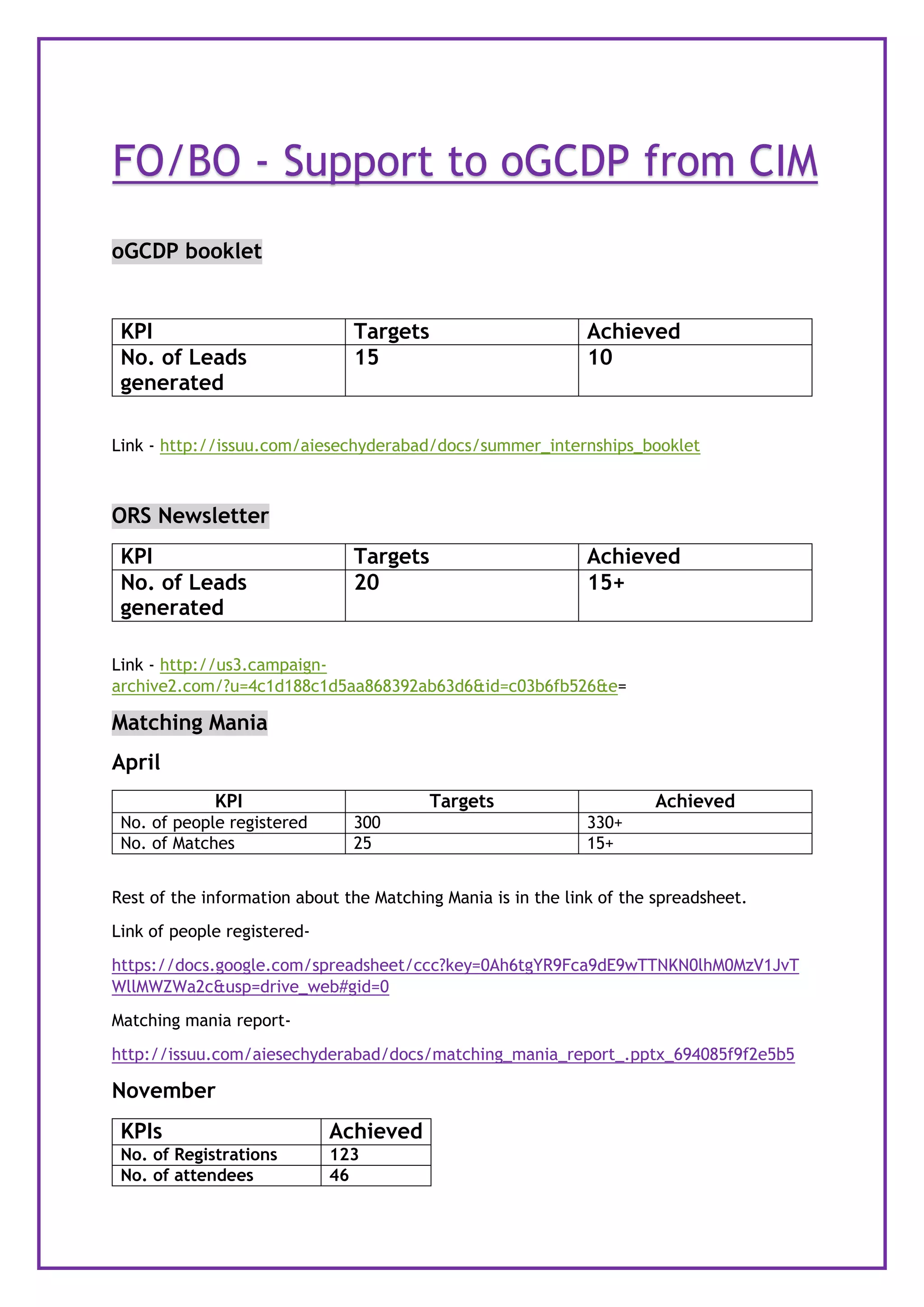 The document reports on the key performance indicators achieved for various events and activities conducted by the organization: