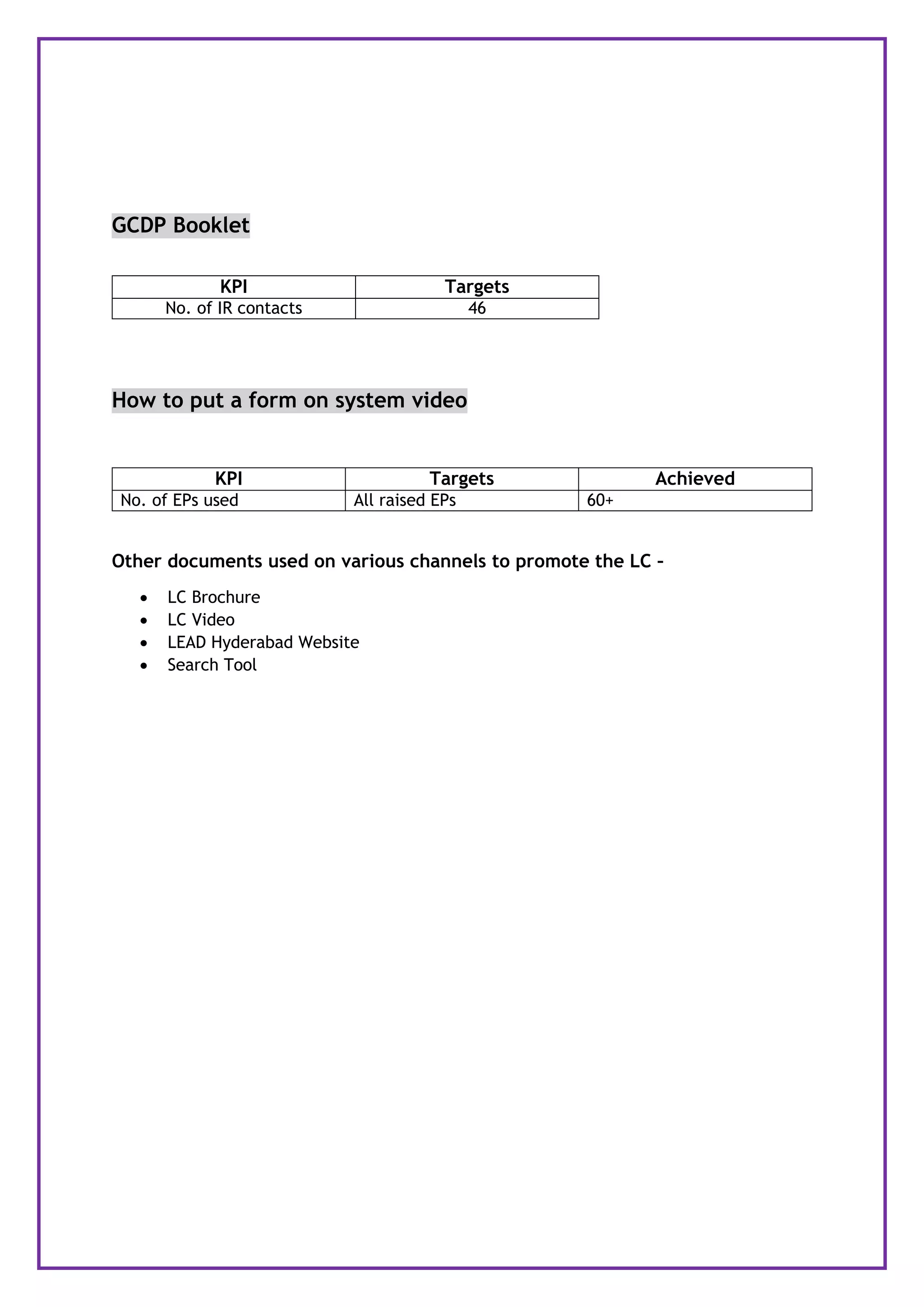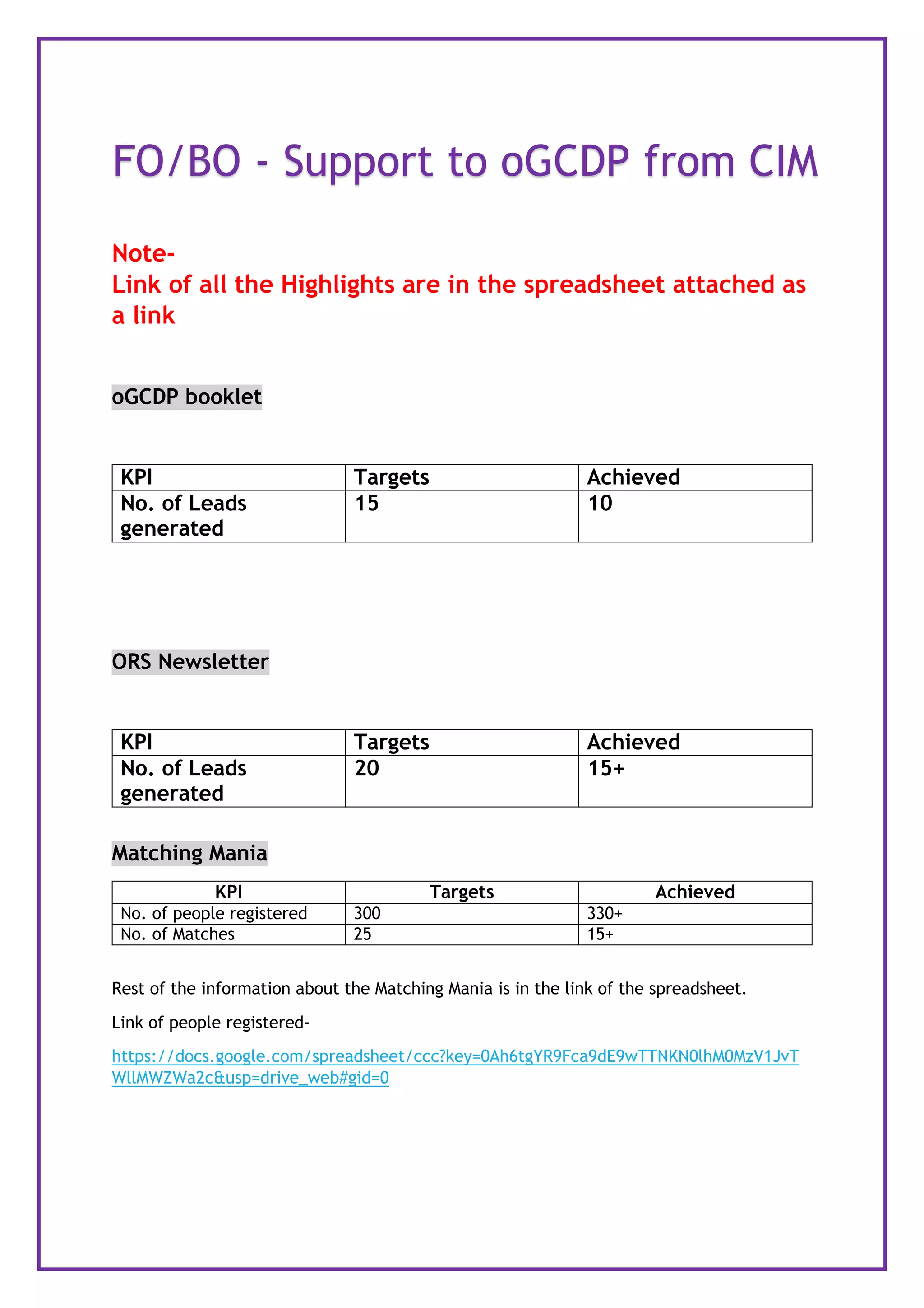 The document summarizes the results of various marketing initiatives for an organization. It provides key performance indicators, targets, and results achieved for initiatives like the GCDP booklet, ORS newsletter, and Matching Mania event. Links are included for additional details on people registered for Matching Mania and other resources used to promote leadership programs. Overall, the results show the targets were largely achieved or exceeded for generating leads, registrations, and contacts through these outreach activities.