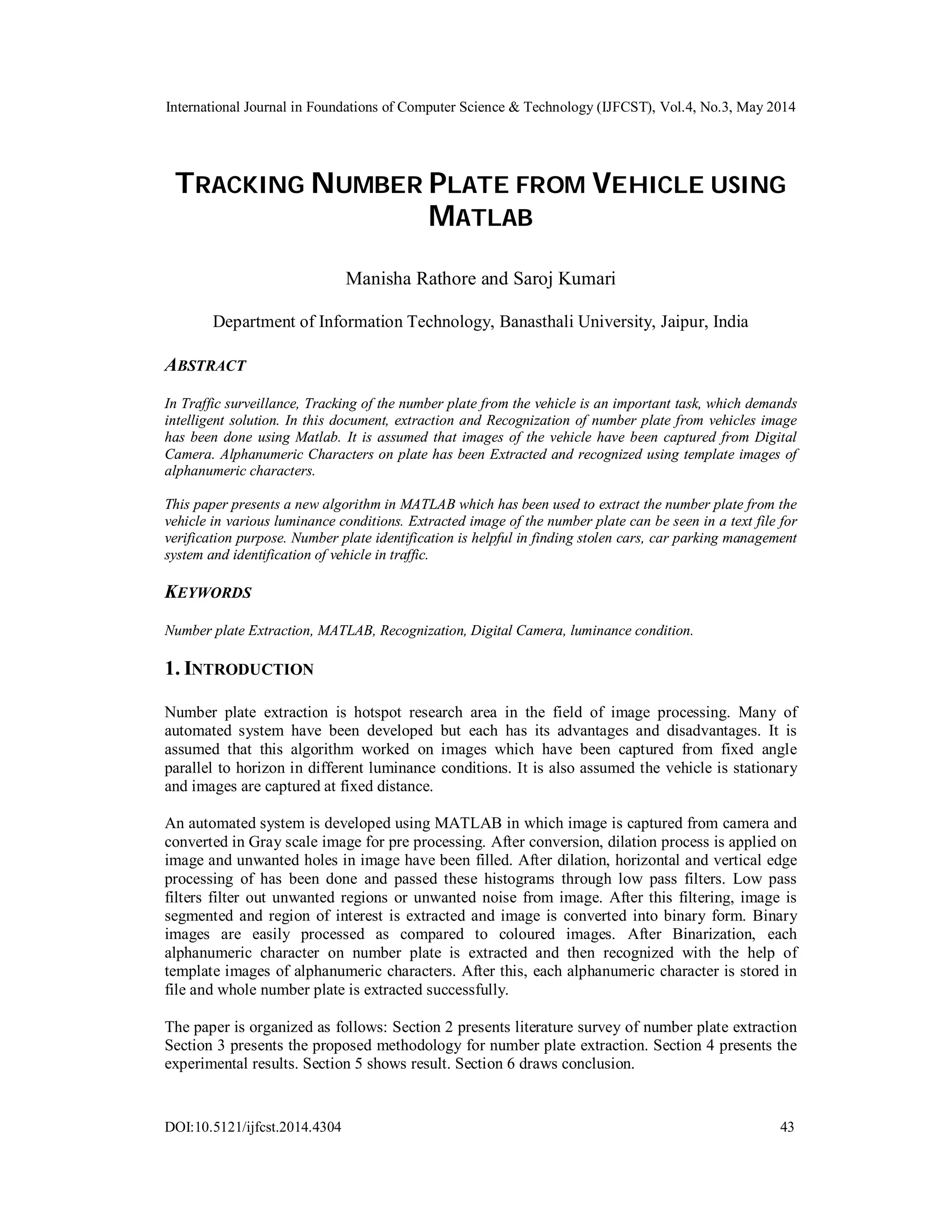 This document presents a new algorithm in MATLAB to extract vehicle number plates from images in various lighting conditions. The algorithm uses preprocessing techniques like grayscale conversion, dilation, and edge detection. It then segments the region of interest containing the number plate and extracts it. Individual characters are then segmented and recognized using template matching. The algorithm achieves 99% accuracy on images taken from a fixed angle and distance under controlled conditions. It is less accurate for images with problematic backgrounds or lighting. The algorithm provides an automated way to extract number plates for applications like traffic monitoring, parking management, and stolen vehicle identification.