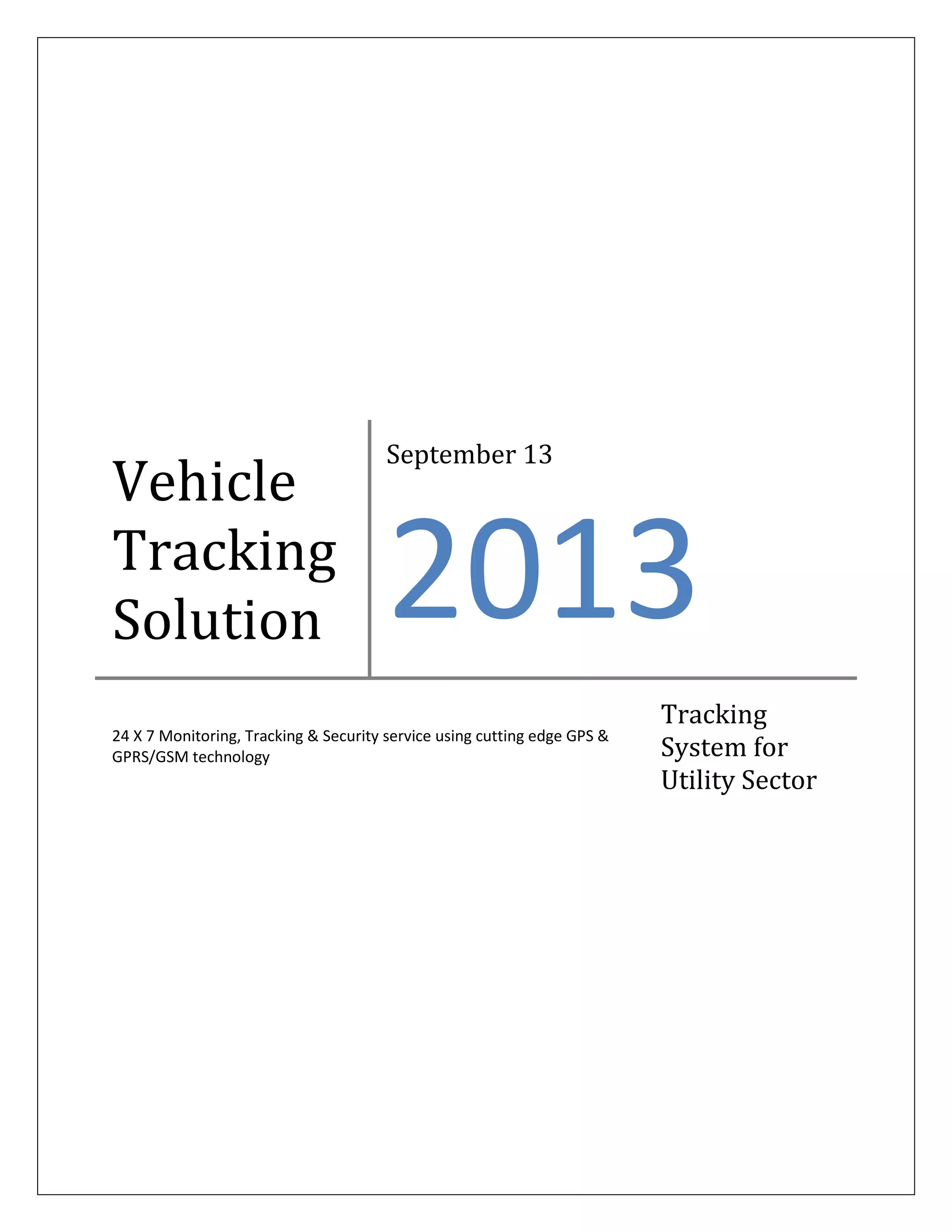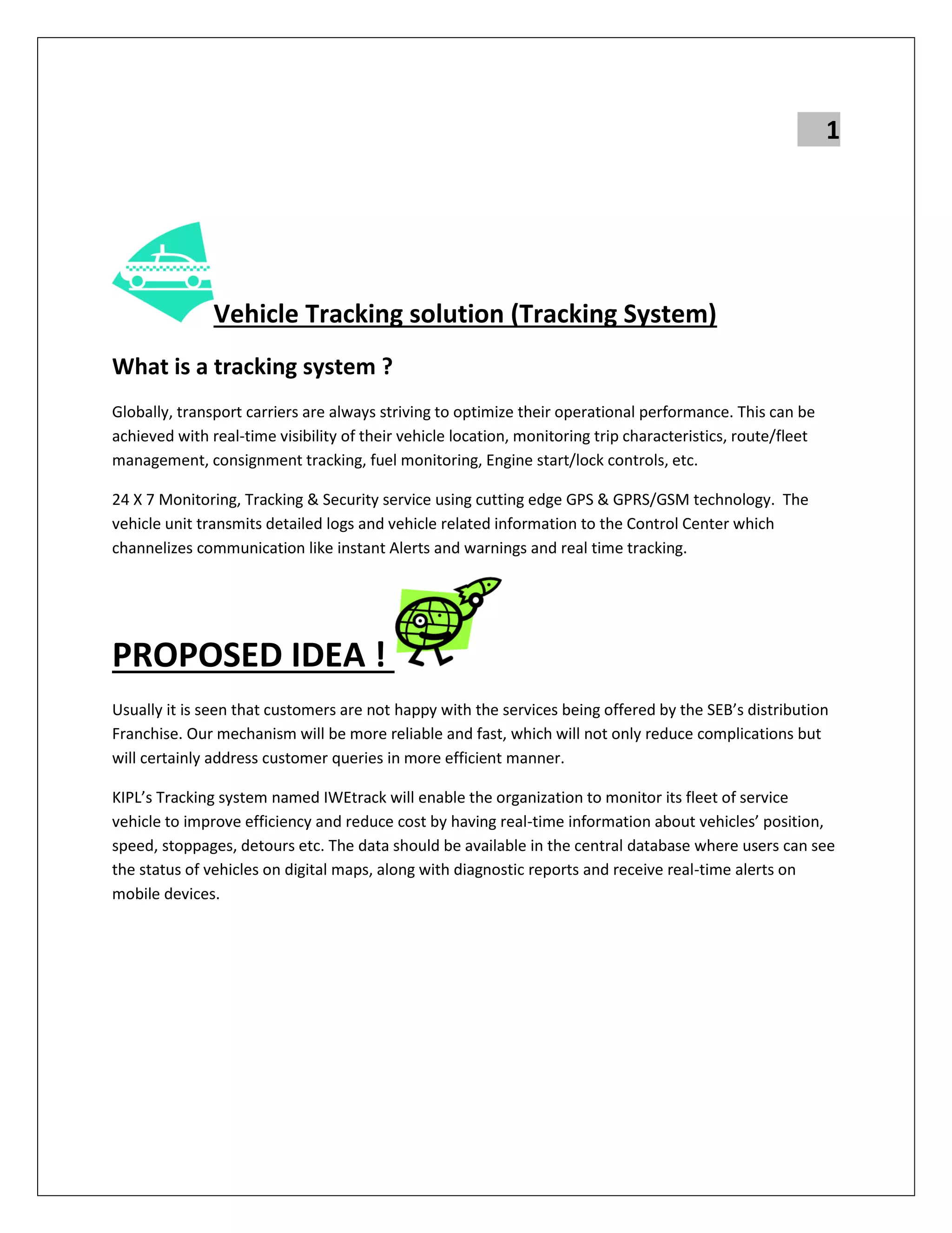 This document describes a vehicle tracking solution that uses GPS and GPRS/GSM technology to monitor vehicles in real-time. It allows users to view vehicle locations, speeds, stop times, routes and receive alerts. The system would install tracking devices on vehicles that transmit data to a control center. This would allow more efficient complaint handling by directing issues to the nearest vehicle and better collection services by informing customers of vehicle locations. The system provides reports, maps of vehicle routes, user management and three months of historical data storage. Benefits include improved safety, scheduling and cost reductions from optimized routing and monitoring for unauthorized use.