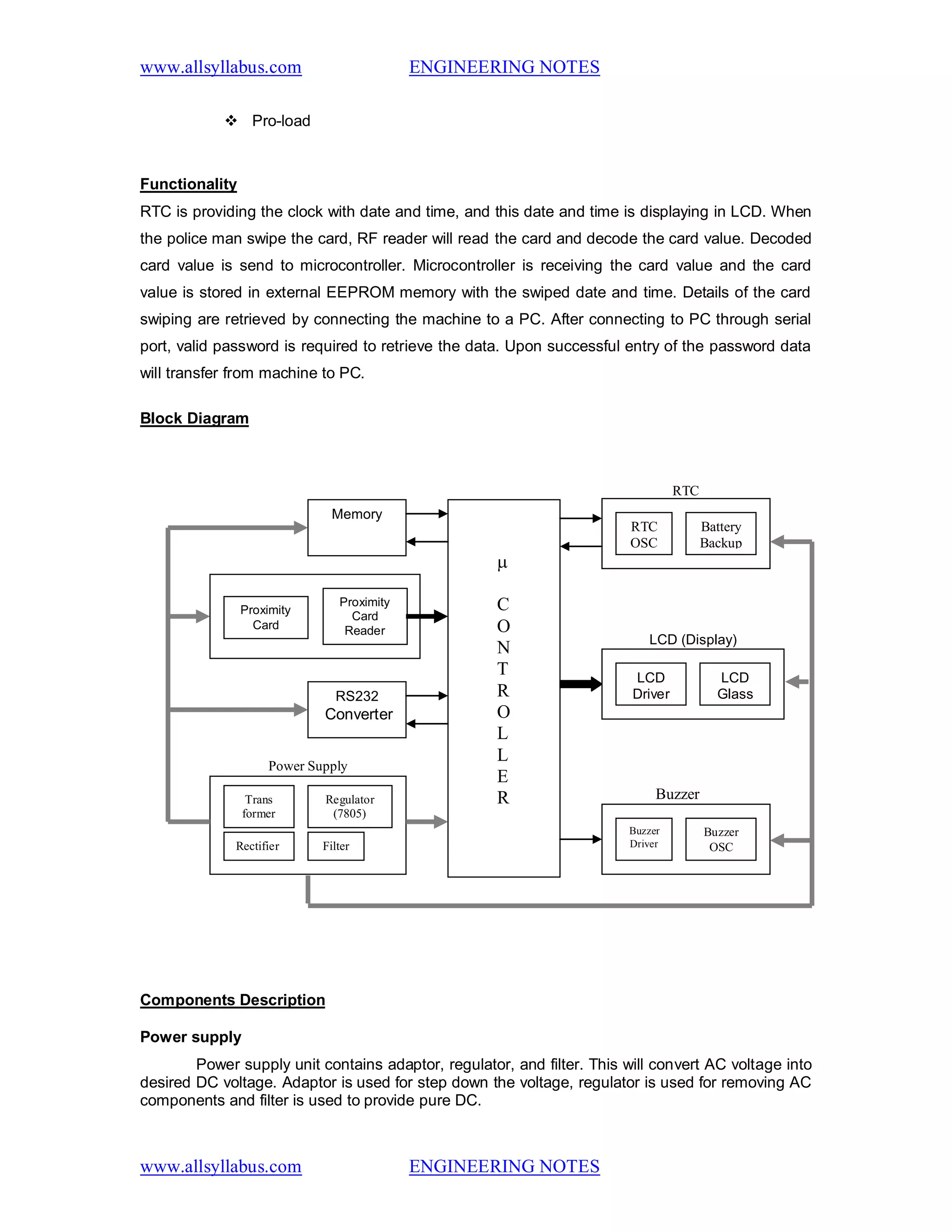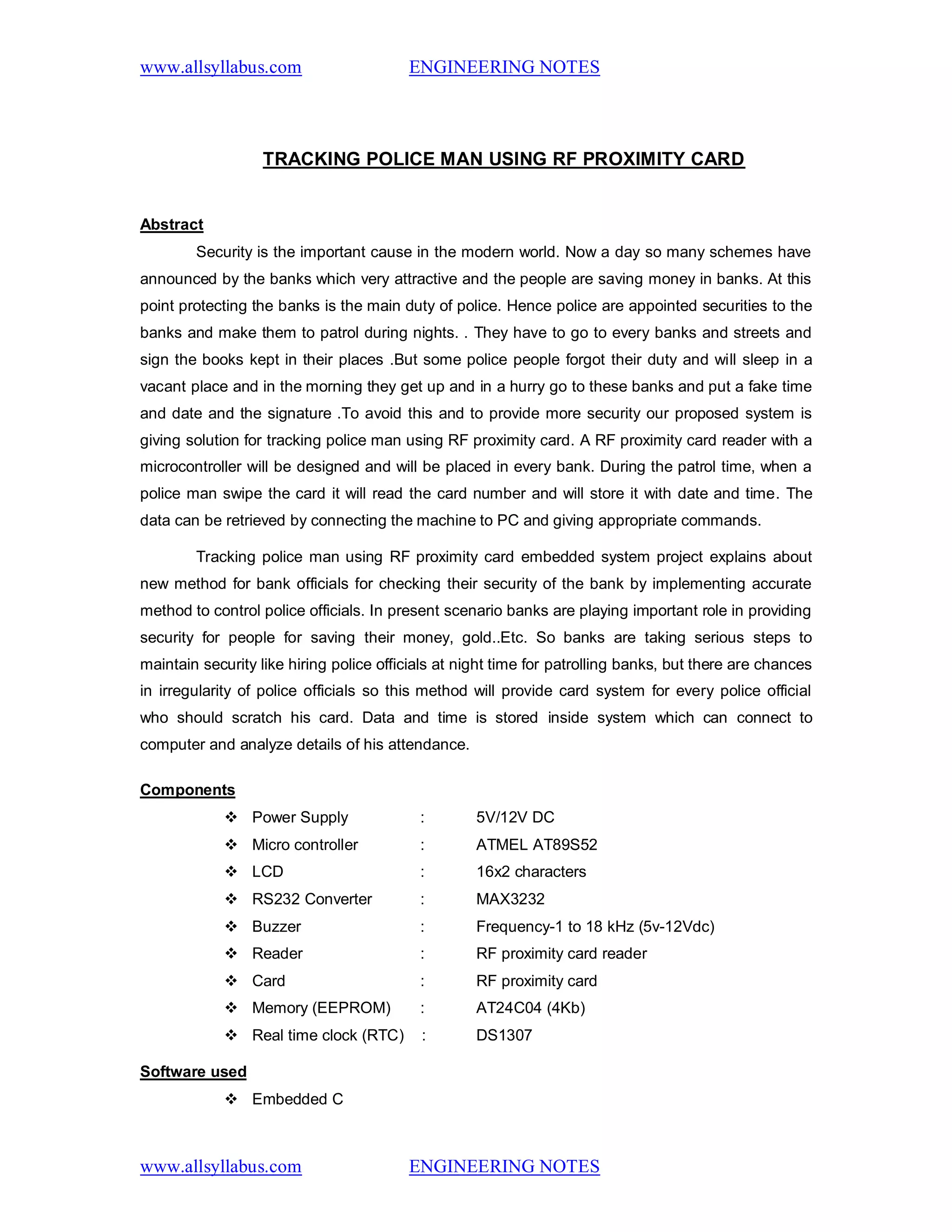 The document outlines a proposed system for tracking police officers using RF proximity cards to enhance bank security during nighttime patrols. The system involves a reader connected to a microcontroller that records the officer's card number, date, and time of swiping, with data retrievable via a PC. Components include a power supply, microcontroller, LCD, memory, and buzzer, all designed to minimize irregularities in police attendance and improve accountability.