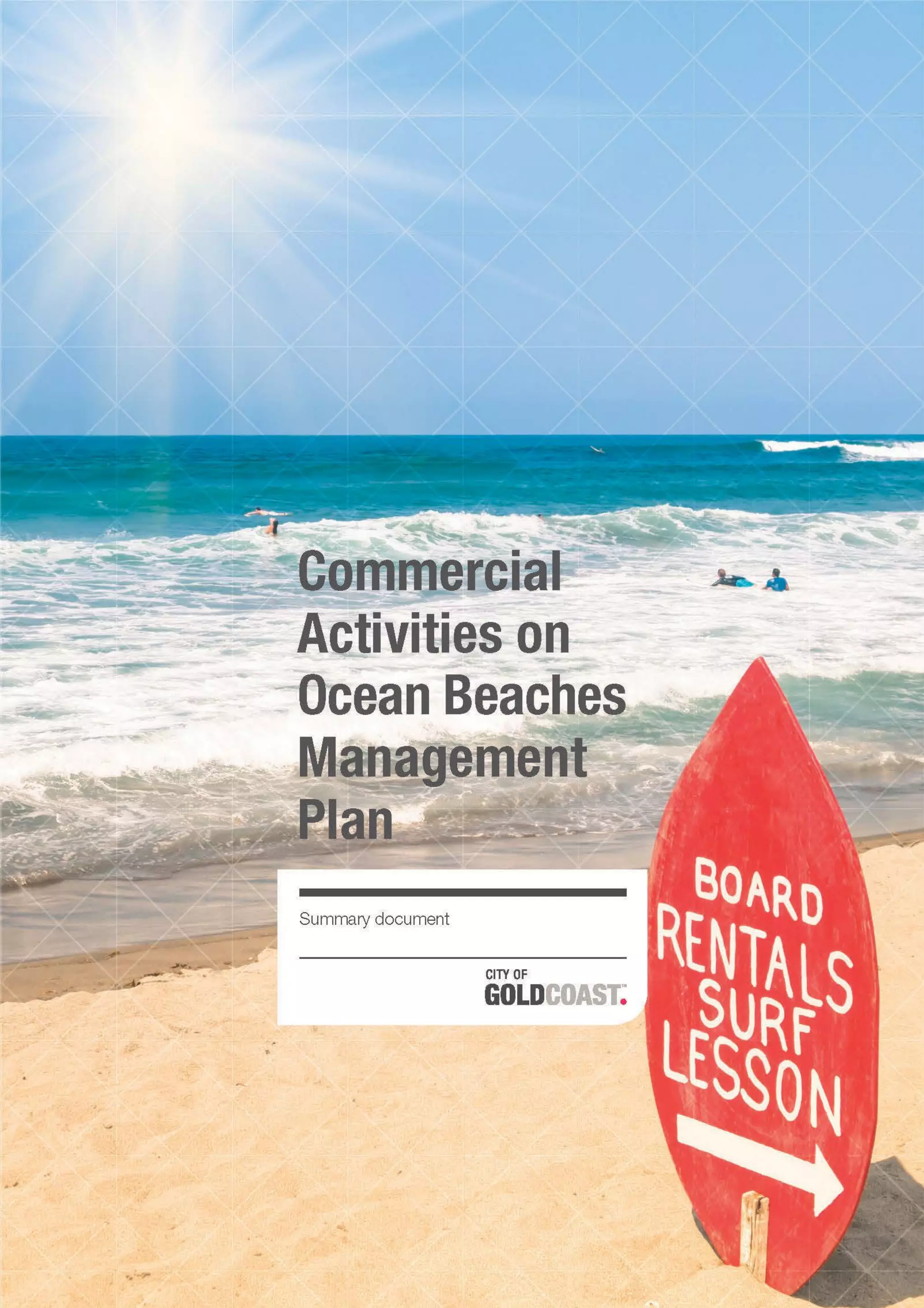 The Gold Coast's management plan for commercial activities on ocean beaches aims to clarify regulations, ensure safety, and balance commercial and non-commercial uses. The plan outlines approved activities, including events, filming, and equipment hire, while emphasizing community consultation for feedback. It ensures compliance with local laws, promoting stewardship for the management of the beaches.