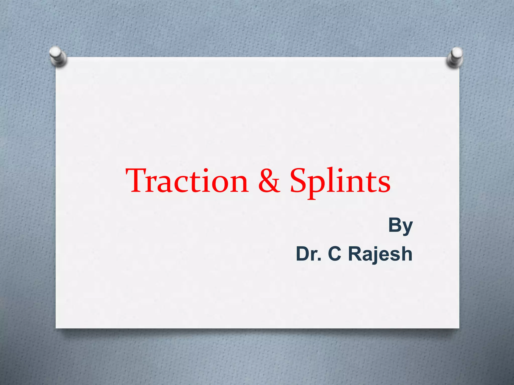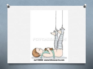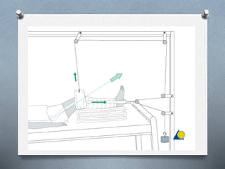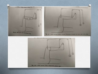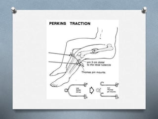This document discusses various types and methods of traction and splinting. It defines traction as a force applied to overcome muscle spasm. There are different types based on application method (skin vs skeletal) and mechanism (fixed vs sliding). Skeletal traction involves pins or wires inserted into bones, while skin traction uses straps applied externally. Various splints and suspension systems are described to immobilize fractures using traction. Complications can include infection, pressure sores, and nerve damage.