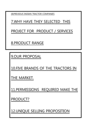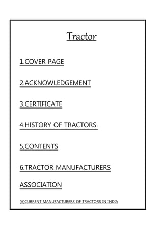 This document provides an overview of the history and development of the tractor industry in India from the 1940s to present day. It discusses the key periods of growth in local tractor production and manufacturing, from the initial imports in the 1940s to India becoming one of the world's largest tractor producers by the late 1990s. It also lists the current major tractor manufacturers in India, including Mahindra, Escorts, John Deere, Sonalika International, and others, and models/horsepower ranges. Previous companies from the 1970s-80s that did not survive are also mentioned.