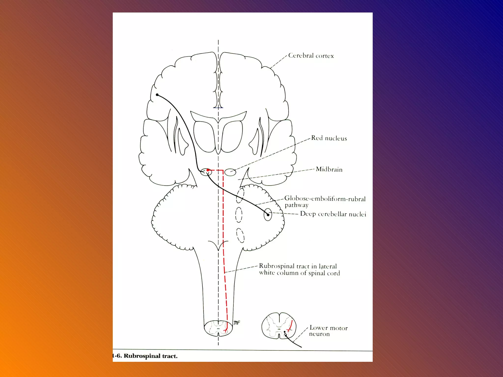 Rubrospinal tract nervecells in red nucleus ( tegmentum of midbrain at the level of superior colliculus ) nerve fibres / axons cross the mid line descend as rubrospinal tract through pons and medulla oblongata terminate anterior gray column of spinal cord ( facilitate the activity of flexor muscles )