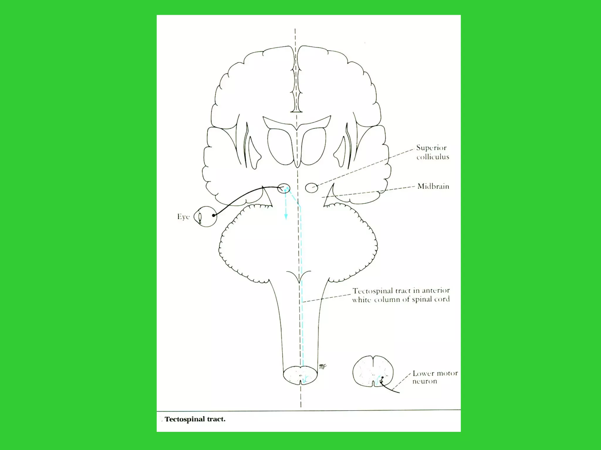 Tectospinal tract nervecells in superior colliculus of the midbrain nerve fibres/ axons cross the mid line descend close to medial longitudinal fasciculus terminate in the anterior gray column of upper cervical segments of spinal cord ( responsible for reflex movement of head & neck in response to visual stimuli )