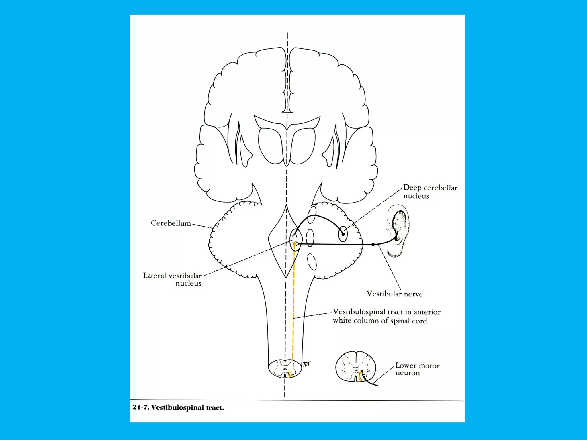 Vestibulospinal tract nervecells in vestibular nucleus (in the pons and medulla oblongata received afferents from inner ear and cerebellum axons descend uncrossed through medulla and through the length of spinal cord synapse with neuron in the anterior gray column of the spinal cord ( balance by facilitate the activity of the extensor muscles )