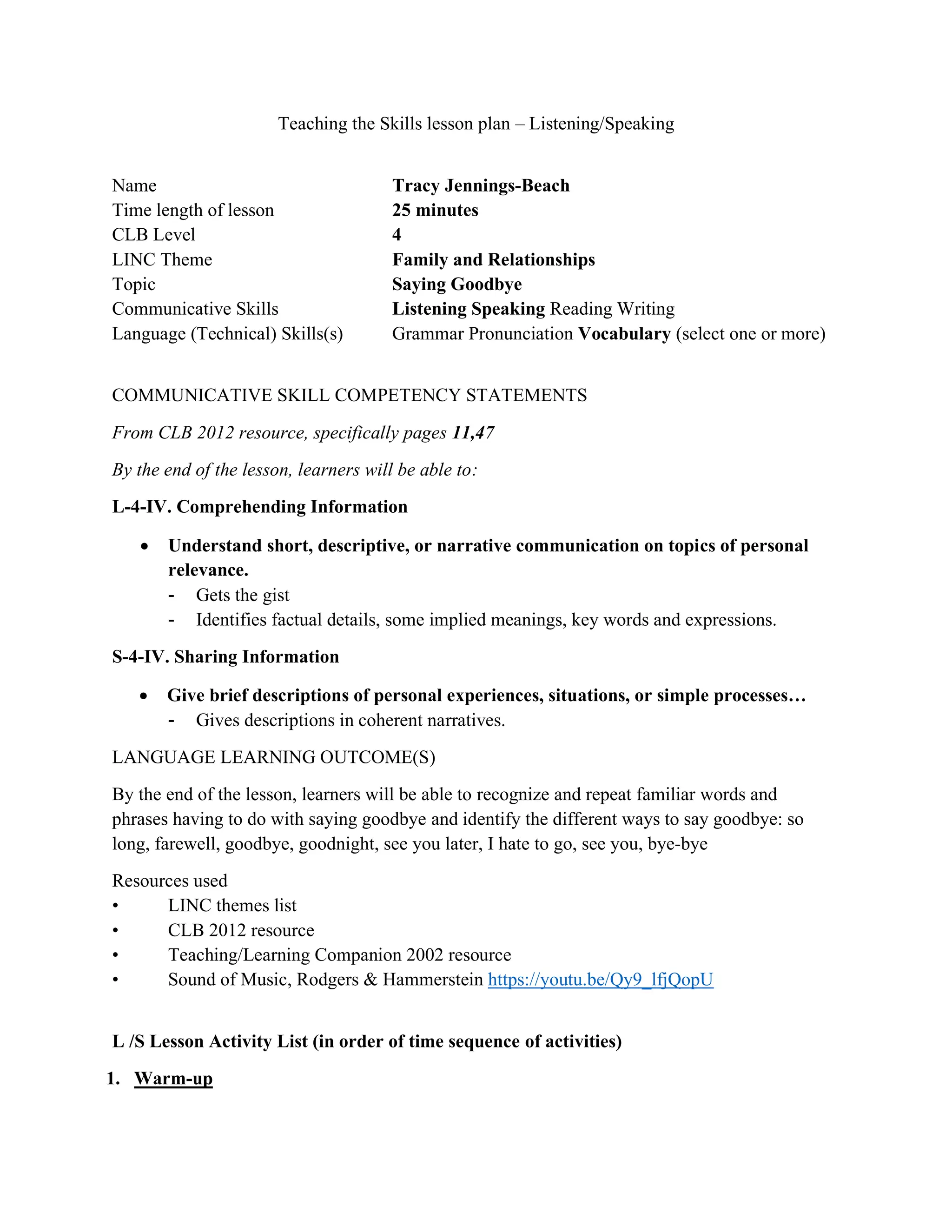 This lesson plan is for a 25-minute listening and speaking lesson at CLB level 4 about saying goodbye. The lesson uses a song from The Sound of Music called "So Long, Farewell" to teach vocabulary for saying goodbye in English. Learners will do warmup activities, pre-listening tasks to predict the story and learn vocabulary, during-listening tasks to understand the gist and details of the song, and a post-listening speaking activity where learners individually say how they would say goodbye and what they would miss most about the class.