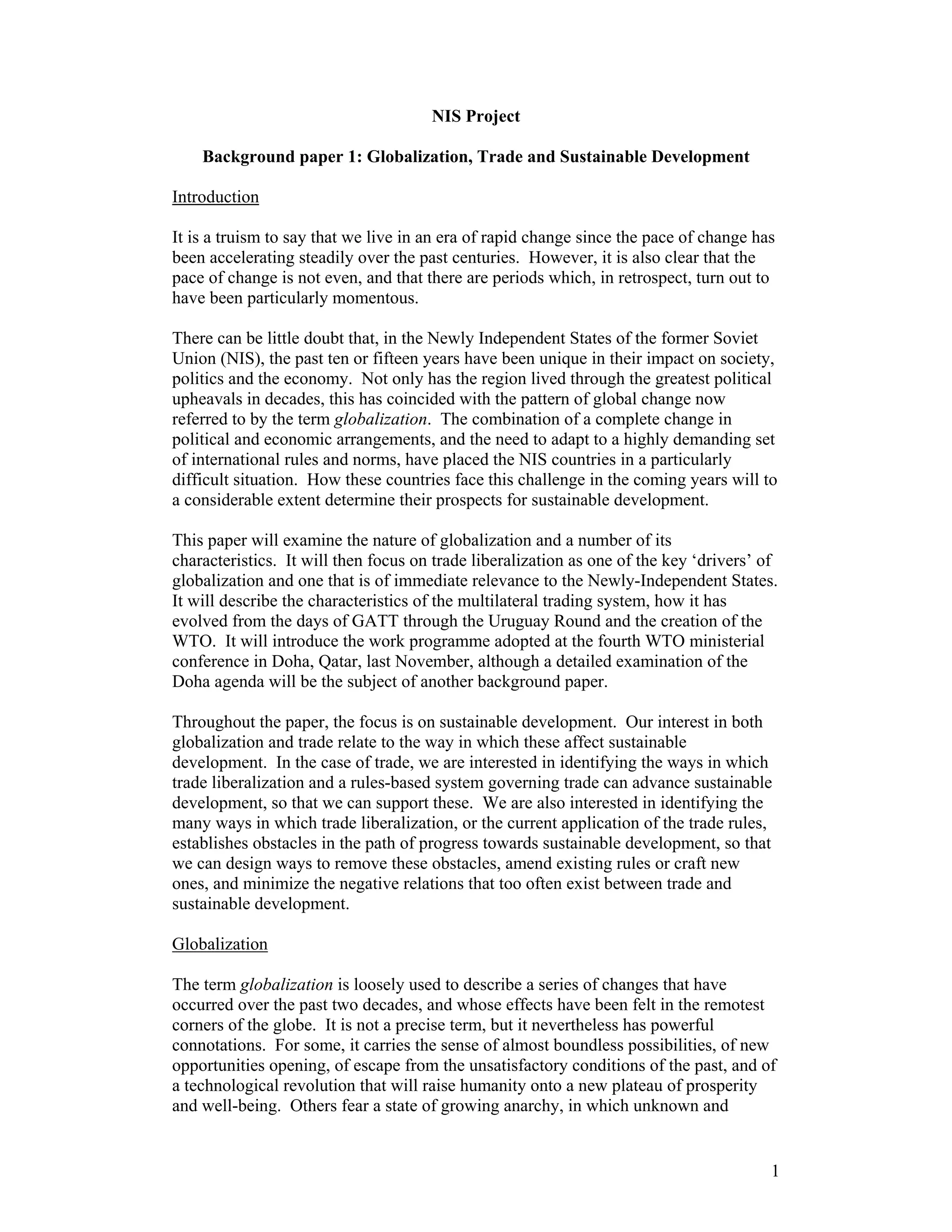 This document provides background on globalization and trade liberalization. It discusses how globalization has led to changes like the spread of technology and standardized economic rules. It also examines criticisms of globalization from the anti-globalization movement and concerns that its benefits are not evenly distributed. The document then focuses on trade liberalization as a key driver of globalization, outlining the traditional arguments for its economic and political benefits, the evolution of the multilateral trading system, and its founding principles of transparency, non-discrimination, and peaceful dispute resolution.