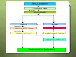 A trademark is a distinct visual symbol used to identify and differentiate goods or services from different undertakings, and must be registered under one of 45 classes as specified in the Trademark Act. The registration process takes approximately 12-15 months and involves filing an application, examination, potential opposition, and final registration, with a need for renewal every ten years. If a trademark is not used for five years, it may be forfeited.