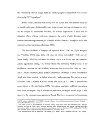 This document summarizes a study examining the relationship between trade openness and city sizes using the New Economic Geography framework. The study finds that as trade openness increases, the size of main cities declines while the size of secondary cities increases. Similar results are seen for cities with over 1 million people. However, cities that make up a large share of the urban population do not see the same relationship with trade openness. The implications are that investment in infrastructure should target secondary cities during trade liberalization, especially port cities.