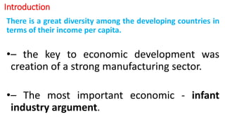 The document discusses trade policies in developing countries, including import substitution industrialization (ISI). ISI aims to reduce dependence on developed nations by protecting and developing domestic industries to compete with imports. While ISI initially saw some success, problems emerged such as inefficient production scales and governments slow to remove protections. Most developing countries rejected ISI in the 1980s-1990s due to unsustainability and pressure from IMF/World Bank for more open trade policies.