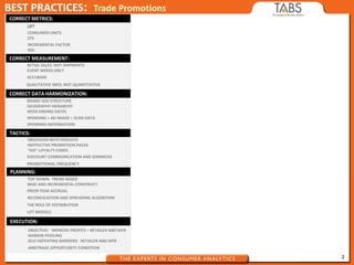 The document discusses best practices for trade promotions, including using correct metrics like retail sales instead of shipments, correct data harmonization of factors like brand size and geography, and planning promotions based on lift models and trend analysis. It also recommends focusing on objectives like improving profits for retailers and manufacturers, and avoiding ineffective tactics such as an over-reliance on displays or "dis-loyalty" cards. Key metrics discussed include incremental sales, return on investment, and consumer units.