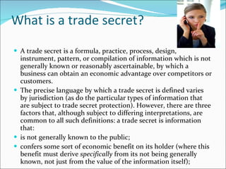 A trade secret is confidential business information that provides an economic advantage over competitors. It must not be publicly known, provide some economic benefit from being secret, and reasonable efforts must be taken to maintain its secrecy. Confidential information refers to sensitive information received in confidence from another party that one has a duty to not disclose without permission. Both trade secrets and confidential information involve keeping certain business or personal information private, but trade secrets specifically provide an economic advantage from being secret.
