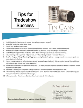 The document provides tips for achieving success at a tradeshow. It recommends establishing goals and responsibilities in advance, promoting the booth before and during the event through various media, collecting contact information from visitors, following up after the show, and taking advantage of opportunities to sponsor or present at the event.