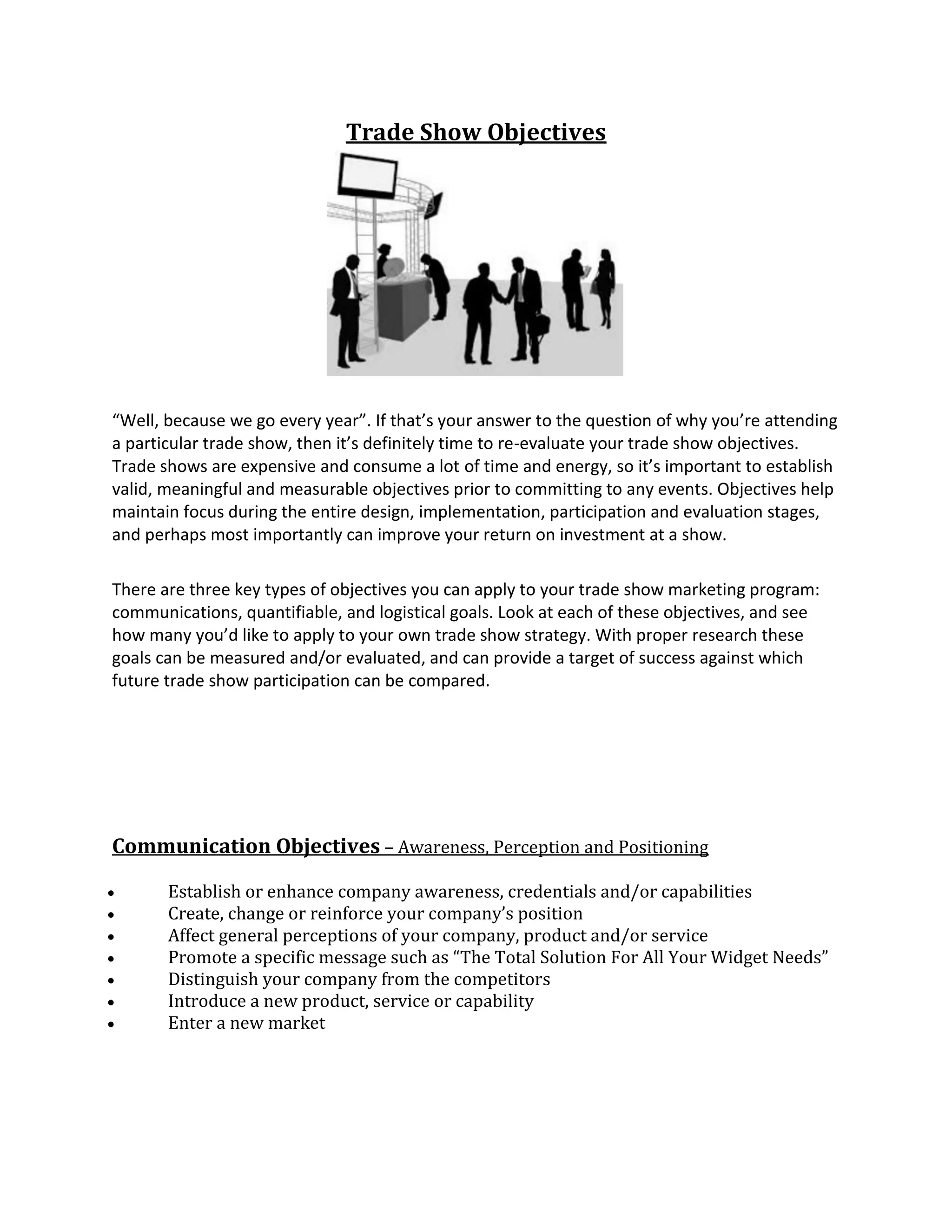 The document discusses the importance of setting meaningful and measurable objectives for attending trade shows, emphasizing that participation should not be a mere habit. It outlines three key types of objectives: communications, quantifiable, and logistical, each serving distinct purposes to enhance focus and improve return on investment. The author encourages readers to develop a list of objectives to guide their trade show strategy and validate their participation decisions.