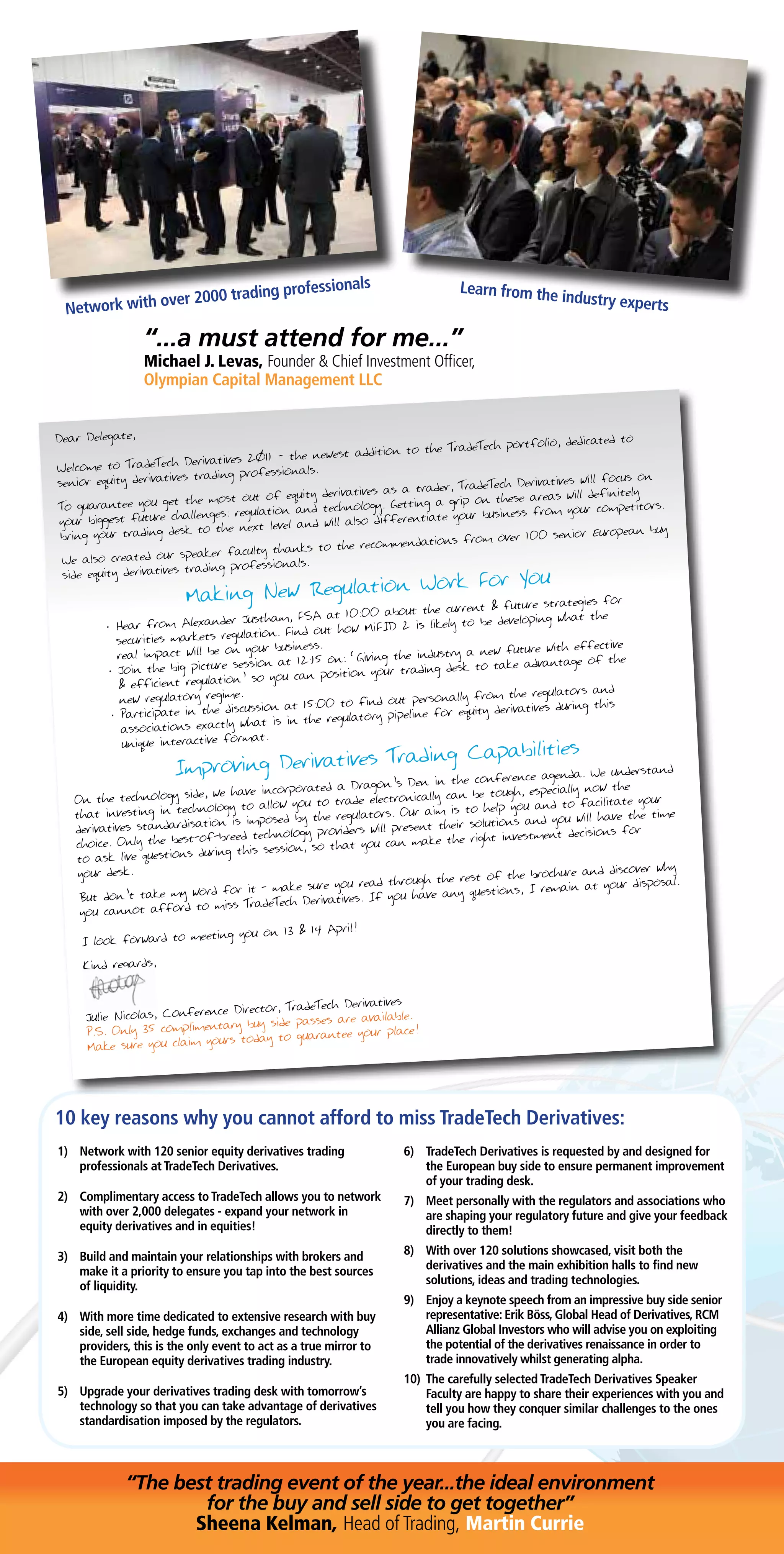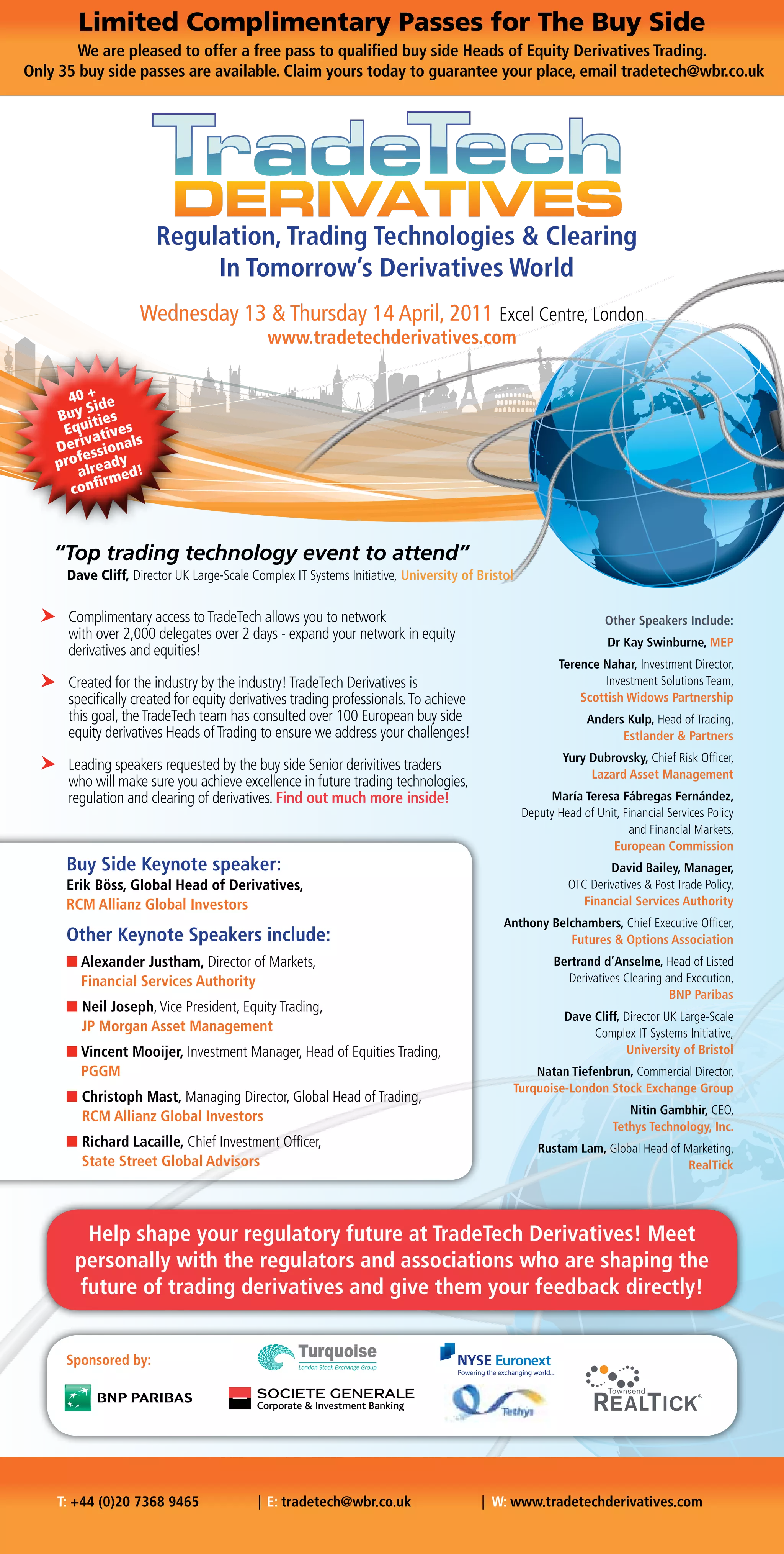 The document outlines the Tradetech Derivatives Conference, offering 35 complimentary passes for qualified buy-side heads of equity derivatives trading, emphasizing networking opportunities with industry experts and regulators. Scheduled for April 13-14, 2011, in London, the event features keynote speeches and panel discussions on future regulations, trading technologies, and the evolving landscape of equity derivatives. The conference aims to equip attendees with insights and strategies to navigate challenges and seize opportunities in the derivatives market.