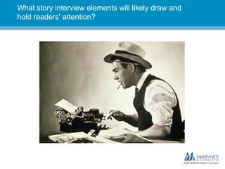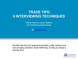 The document provides 6 interviewing techniques for public relations and marketing professionals to help shape a winning story: 1) Understand the story's purpose and goal. 2) Remove any biases and let the story flow naturally. 3) Share important details early in the piece. 4) Weave significant elements throughout to tie the story together. 5) Capture the voice of the protagonist who is the focus of the story. 6) Help clients liven up quotes for publication but always share revised quotes for approval.