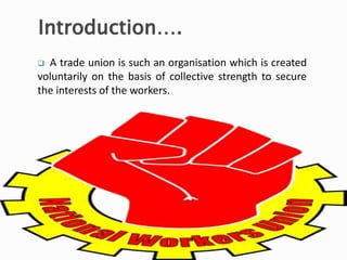 The document discusses the role and evolution of trade unions, highlighting their origins in India and the establishment of the Trade Union Act of 1926. It outlines the advantages of trade unions for workers, employers, and society, emphasizing the importance of collective bargaining and improved industrial relations. A case study of the Hotel Oberoi exemplifies successful collective bargaining, illustrating the potential benefits for both management and workers.