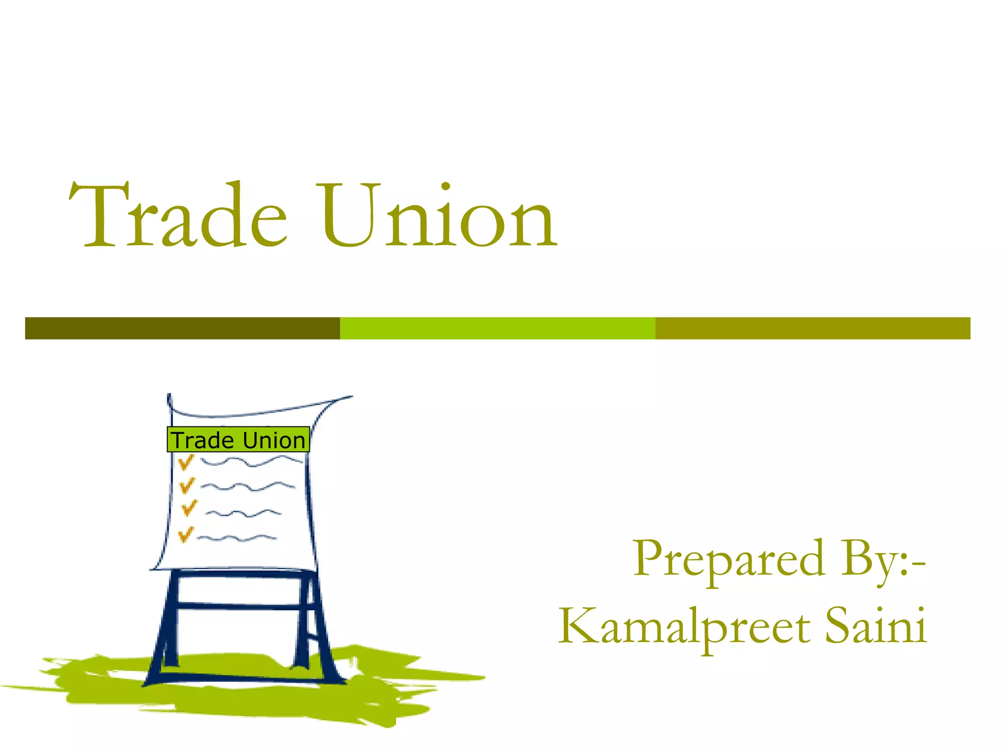 The document provides an overview of trade unions in India, including definitions, objectives, advantages, rights, and liabilities of trade unions. It discusses key aspects such as recognition of trade unions, amalgamation, and dissolution. It also outlines some limitations of Indian trade unions and remedial measures to address problems like maintaining unity, reducing political influences, providing worker education, ensuring adequate funds, and prioritizing welfare activities.