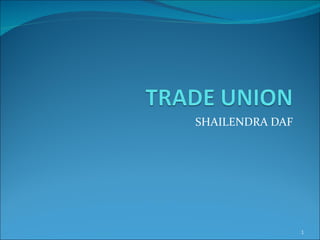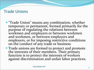 Trade unions represent workers and their interests such as wages, working conditions, and protections against unfair practices. They negotiate with employers on behalf of workers and provide member services. Trade unions play important roles in regulating relations between workers and employers, promoting economic development, and achieving industrial peace. In India, trade union membership grew after independence and there are now several major central trade union organizations.