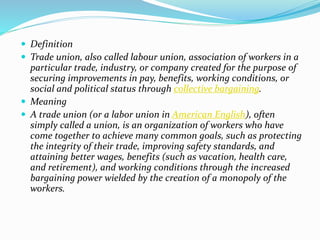 A trade union, also called a labor union, is an organization of workers who have come together to achieve common goals such as better wages, benefits, and working conditions through collective bargaining. Trade unions originated in the 19th century in countries like Britain and the US as workers organized against exploitation. While British unions pursued political activism and the formation of labor parties, American unions focused on collective bargaining. Today, unions represent millions of workers globally and have helped secure improved economic outcomes, though they may also potentially cause issues like unemployment or wage inflation if they become too powerful.