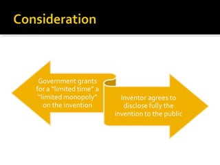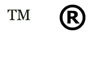 The document discusses intellectual property and trademarks. It defines intellectual property as property that arises from human intellect, such as ideas, designs, poems, and music. It notes that intellectual property rights protect inventions and creations by preventing unauthorized copying. The key types of intellectual property discussed are patents, copyrights, and trademarks. Patents protect inventions, copyrights protect original creative works, and trademarks distinguish the source of goods and services. The document outlines the trademark registration process in India and criteria for determining if a trademark is valid.