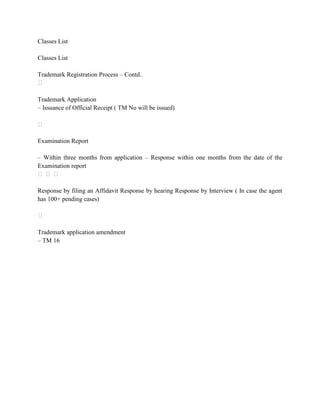 The document outlines the trademark registration process in India. It is a multi-step process that begins with classifying the trademark, searching for similar existing marks, and filing an application. The application is examined, there may be an examination report and response required. If accepted, the mark is published for opposition and can be registered initially for 10 years, with renewals. It also provides details on trademark offices and jurisdictions, documents required for filing, and expedited registration options.
