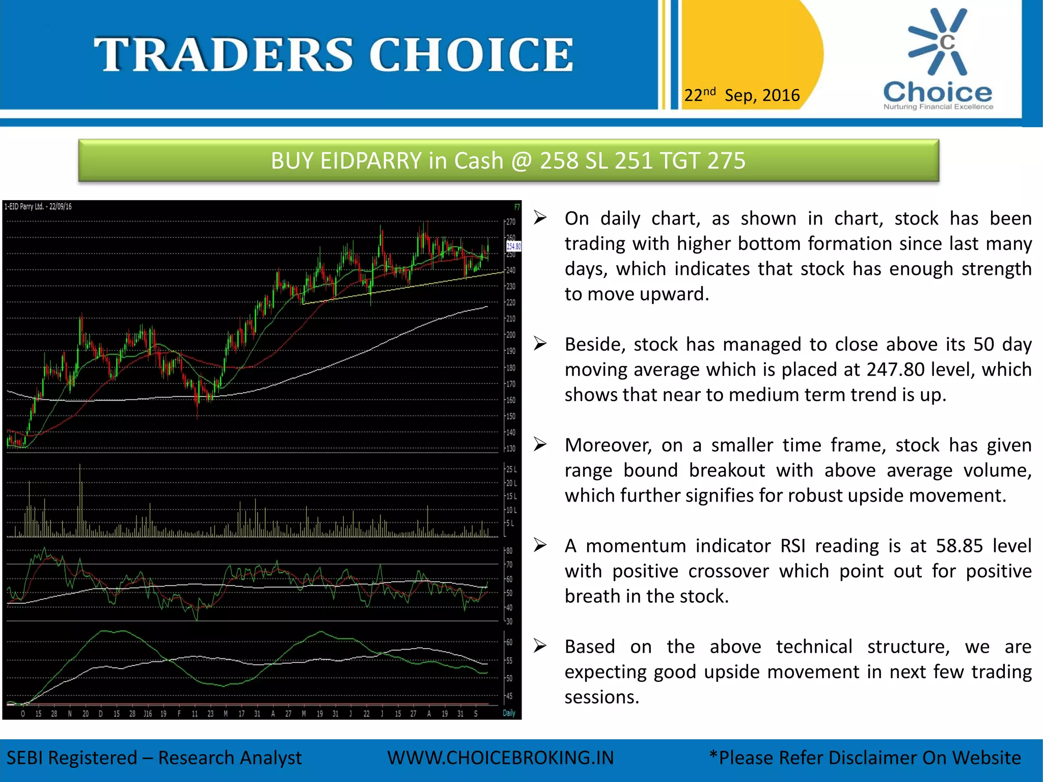 The document provides a technical analysis of EIDPARRY stock and recommends it as a buy. It notes that the stock has been in an upward trend, closing above its 50-day moving average. A recent breakout above resistance with high volume signals further upside potential. Momentum indicators also show positive momentum. Based on this technical structure, an upside movement in the stock is expected over the next few trading sessions.