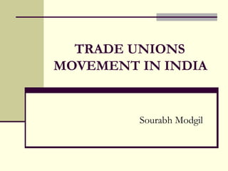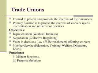 Trade unions in India were formed to protect and promote the interests of workers. Their primary functions are representation in negotiations with employers over issues like wages, benefits, and working conditions. Trade unions are important for maintaining industrial peace through collective bargaining and effective communication between workers and management. They also play a role in economic development through recruitment, discipline in the workforce, and rational dispute resolution. However, trade union growth in India faces challenges from issues like workforce segmentation, employment instability efforts to cut labor costs, and the emergence of non-union firms.